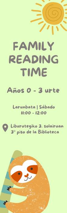 "Family Reading Time" 2022-2025 urteetan jaiotako umeei zuzenduta dago. Familian irakurketa sustatzea du helburu, musika eta errimen bidez, eta hizkuntza desberdinetan: euskara, gaztelania eta ingelesa. Saioak hilean behin izango dira, zapatuetan, 11:00etatik 12:00etara.