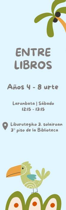 "Entre libros" klubean 2017-2021 urteetan jaiotakoek liburuen mundura hurbilduko dira jolasen eta dinamika desberdinen bidez, irudimena erabiliz eta euren gustu, beldur edo emozioak lotuz. Saioak hilean behin izango dira, zapatuetan, 12:15etik 13:15era.
