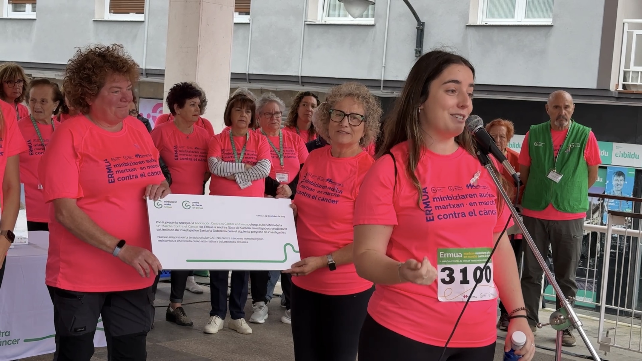 Minbiziaren Aurkako Martxaren XI. edizioa ospatu zen atzo, urriaren 19an. Larrosa izan da aurtengo elastikoaren kolorea, eta berau soinean zeharkatu zituzten Ermuko kaleak 3000 lagunetik gora. 10 euroko kostua zuten inskripzioek eta jasotako dirua Andrea Sáez de Cámara doktoreak zuzendutako "CAR-NK off-the-self" immunoterapia proiektura bideratuko da. Martxa bukatzean, txeke sinbolikoa eman zitzaion ikertzaileari eta partaide guztiekin batera atera zuen argazkia. Guztia bideoan laburtuta.