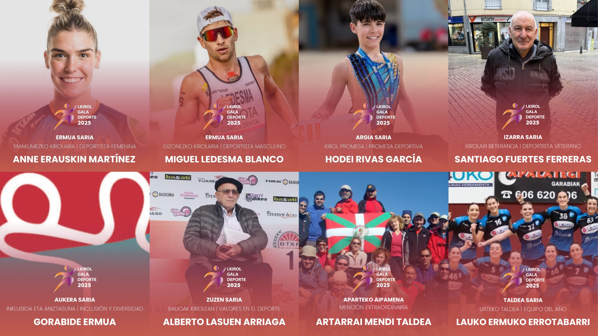 Ermua Sariak urteko kirolariak omenduko ditu eta bi saritu egongo dira: Anne Erauskin Martínez, nazioarteko eskubaloi ibilbideagatik, eta Miguel Ledesma Blanco, triatloian egindako lan nabarmenagatik. Argia Saria promesei zuzenduta egongo da, eta aurtengoa Hodei Rivas García gimnastari emango zaio. Beteranoei dagokienez, Santiago Fuertes Ferreras lasterkariak jasoko du Izarra Saria. Alberto Lasuen Arriagak Zuzen Saria jasoko du, txirrindularitzaren munduan sustatu dituen balioak aitortzeko. Talde onenaren errekonozimendua, Talde Saria izenekoa, Lauko Ermuko Errotabarri seniorrak jasoko du. Urko Sariak ibilbide osoaren errekonozimendua eskainiko du, eta, honetan ere, bi saritu egingo dira: Francisca Suinaga Arrazola eta Alfonso Vicente Andrés. Bukatzeko, Gorabidek Aukera Saria jasoko du inklusioaren alde egindako lanagatik, eta aipamen berezia egingo diote aurten 50 urte bete dituen Artarrai Mendi Taldeari.