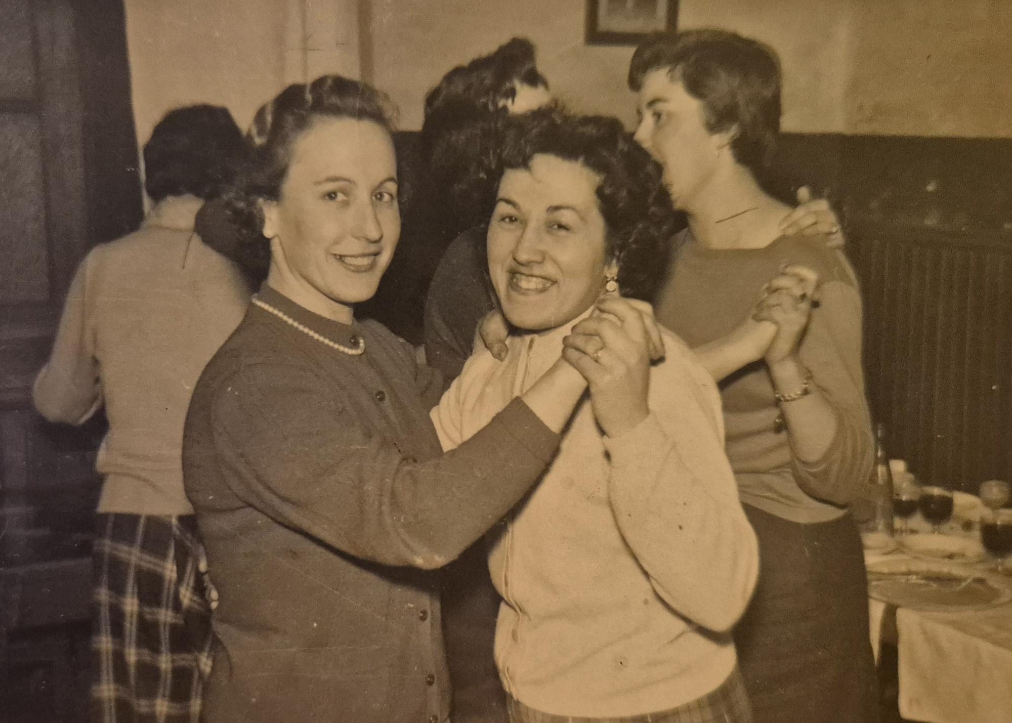Erdikokaleko Herreroneko saloia dantzarako gune estimatua zen eta bertan erretratatu zituzten argazkiaren lehen planoan Mª Angeles Alberdi eta Irune Ormaetxea. Bien atzean, Angeles Gutierrez, Bego Laka eta Miren Laka. Azken bi hauen Aintzane ahizparen solteratako agurra ospatzen ari ziren, koadrilan elkartuta eta afari-merienda batekin. Iluntzi hartan berandutu arte egon ziren kontu-kontari eta dantzan.