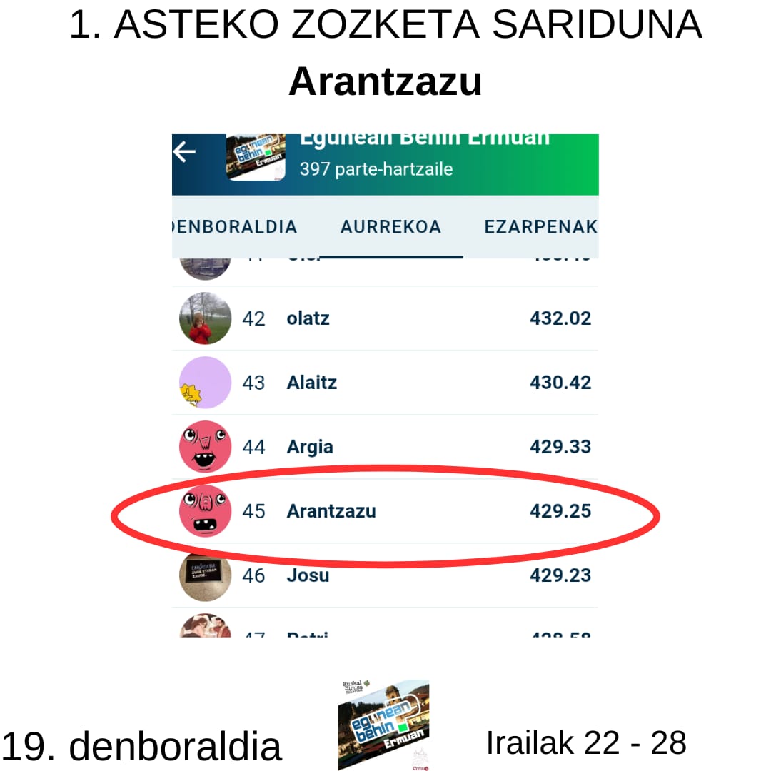 Egunero jokatu dutenen arteko zozketan, 45. postuan geratu denari tokatu zaio saria: Arantzazu , bera, 40 €-ko Ermuko Dendarien Elkarteko dendaren batean erabiltzeko.