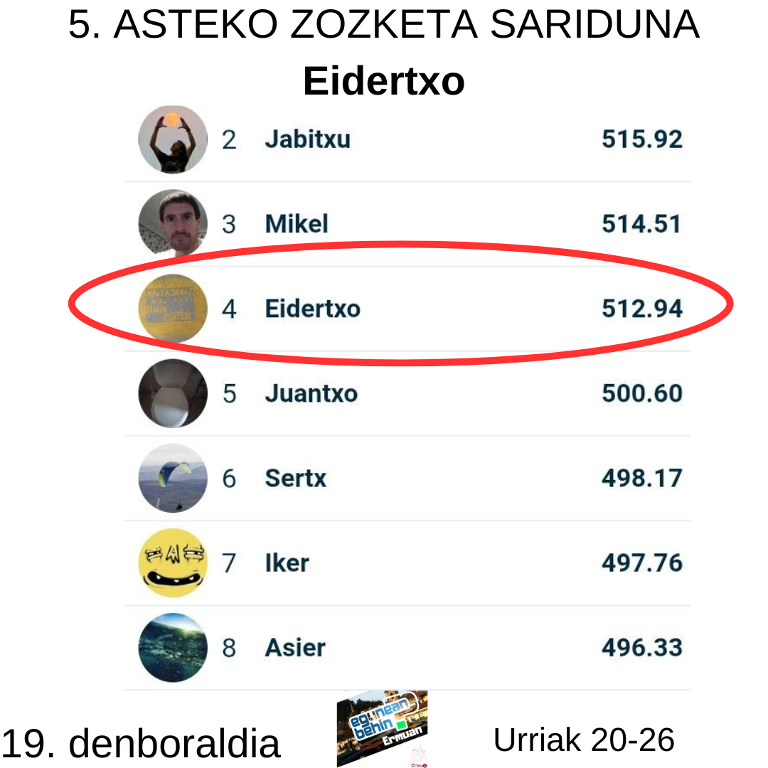 Egunero jokatu dutenen arteko zozketan, 4. postuan geratu denari tokatu zaio saria: Eidertxo, bera, 40 €-ko Ermuko Dendarien Elkarteko dendaren batean erabiltzeko.