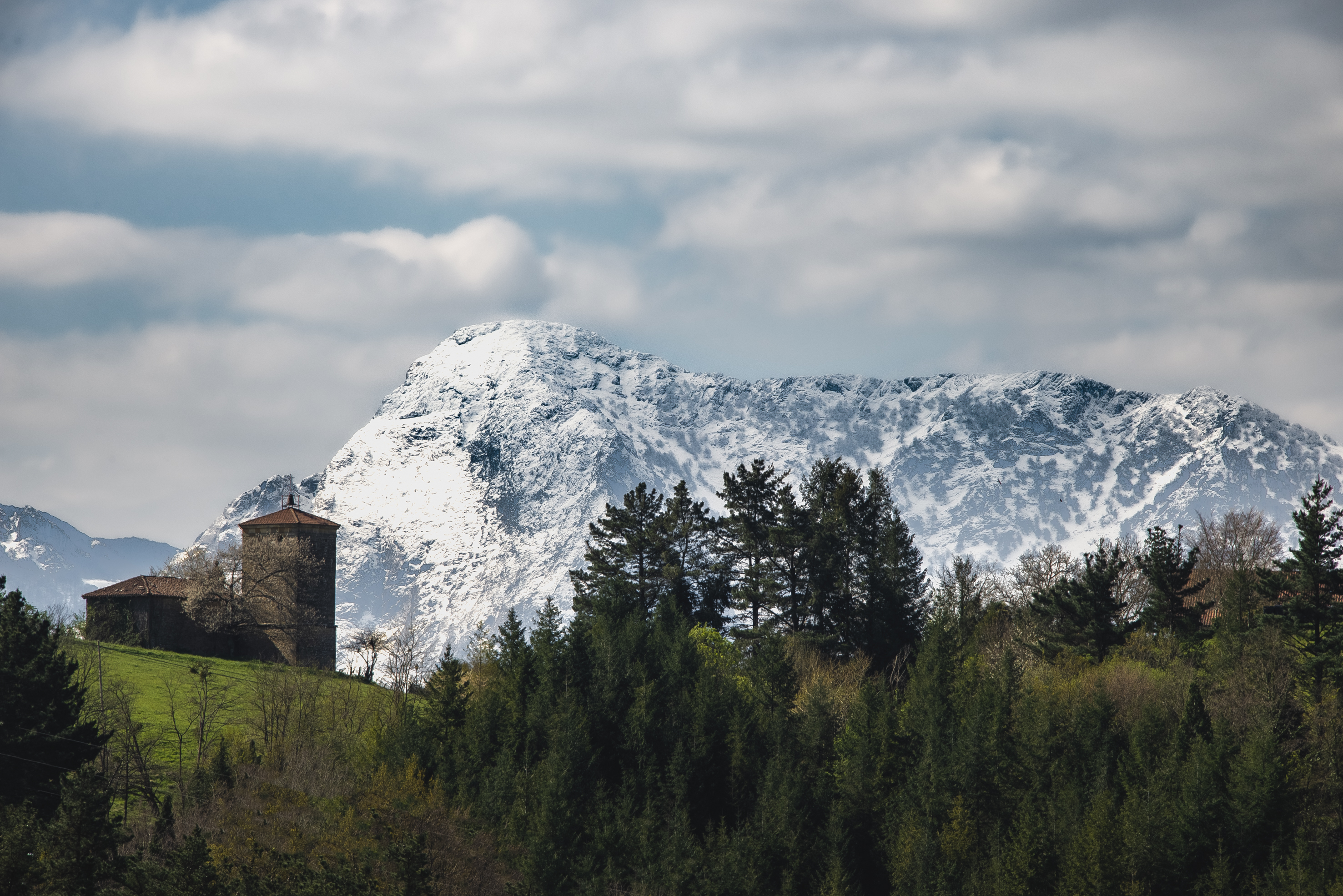 Bidarteko San Pedro baseliza Arandoño auzotik ikusita eta atzean Anboto mendia, elurtuta. Argazkilaria: Fernan Alonso.