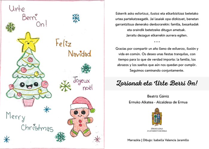 Ermuko postala, ostera, lehiaketa bidez aukeratu da aurten, estreineko aldiz, deialdia OHOko LH4, LH5 eta LH6ko ikasle guztiei zabaldu ostean. Umeen Udal Kontseiluko kideek eta adineko pertsona desberdinek erabaki dute ze irudi saritu eta Isabella Valenciaren marrazki koloretsua aukeratu dute, lau hizkuntzatan Gabon mezuak idatzita dituena. San Pelaio ikastetxean 6. mailan ikasle diharduen neskatoak, Gabonetako argiak piztearen ardura ere izan zuen.